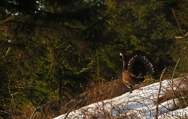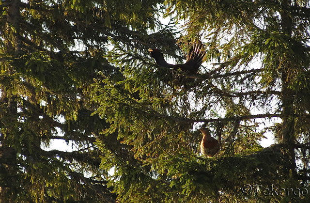 Mire a kakasok beszállnak, én már ott vagyok. Hang alapján legalább négyet számolok körülöttem. Azért hang alapján mert előttem egy sincs. Mintha a múltkori eset ismétlődne. Már jó pár órája üldögélek és még mindig sehol semmi. Lassan megfordulok és a hátam mögött kergetőző kakasokat próbálom messziről megörökíteni. Egyszer csak nagy szárnycsapásokra leszek figyelmes és mit látok...egy jókora "vadpáva" ül egy fa ágán...