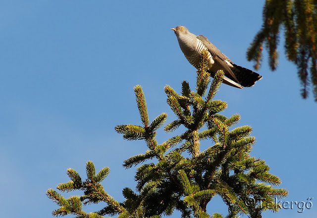 Egy tojó érkezik egy fenyő ágára nem messze tőlem.