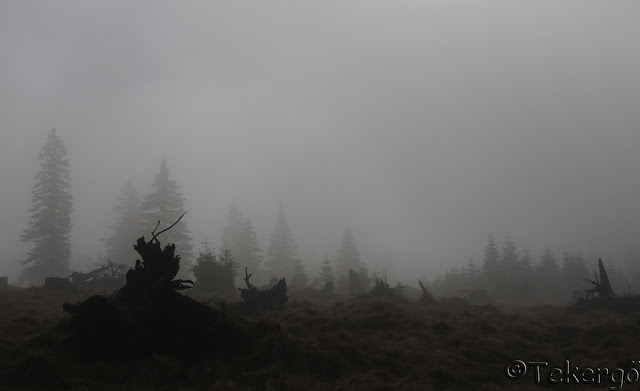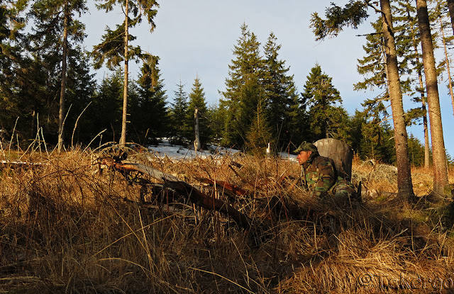 Míg vacsorázunk a szoba lassan bemelegedik és a társaság is a beszélgetésbe. A jókedv nem hagy senkit lefeküdni egyhamar. Így történik, hogy el sem alszunk és már fel is kell kelni. Sötétben indulunk, kint sűrű, gomolygó köd  - a lámpa fénye nem hatol át rajta- szél,víz és hó fogad. Jó órányi, bizonytalan léptekkel megtett út után eligazítást tartanak és a csapat három részre oszlik. Mindenki más helyen megy be az erdőbe, ne legyünk túl közel egymáshoz mert nagy zajt csapnánk. Pirkad mire mindenki megkapja a szerinte legmegfelelőbb leshelyet.