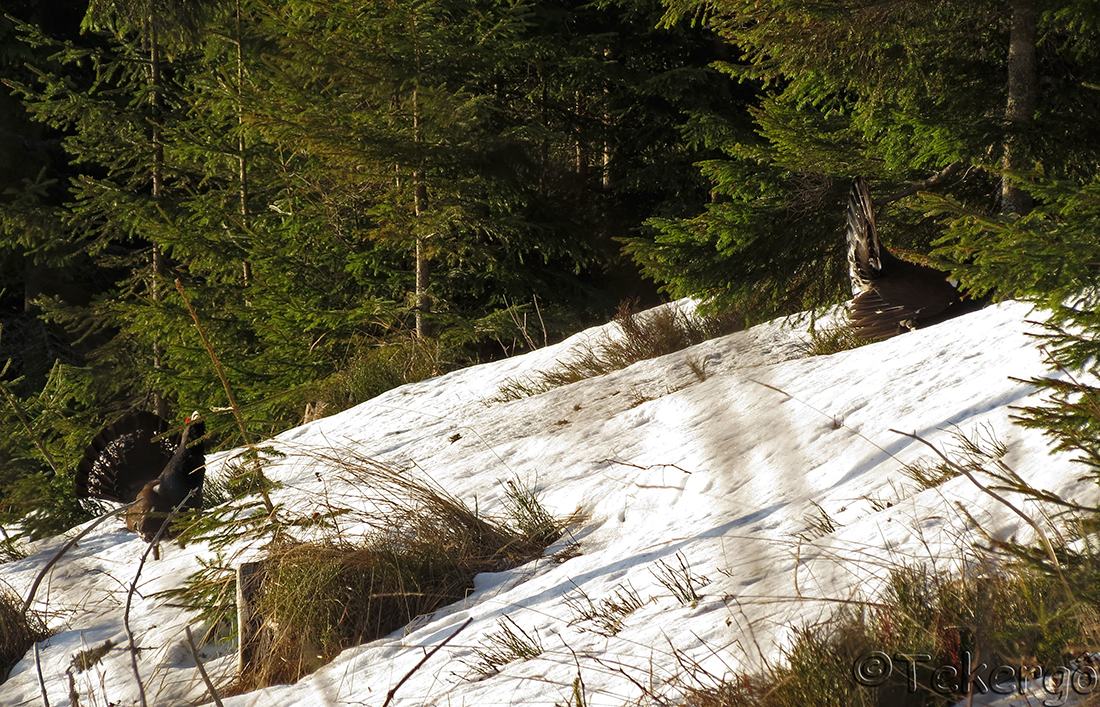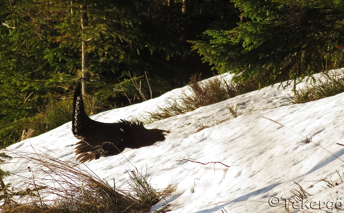 A hó majd minden lépésnél megroppan a lábam alatt, nincs mit tenni ellene. Figyelnem kell a futkározó kakasokat, csak akkor süketek és vakok mikor "köszörülnek" ezen kívül nagyon is figyelmes madarak. Magasan, a fák ágain ülő tyúkok pásztázó tekintete előtt is nehéz észrevétlen maradni. Mindezek ellenére sikerül kijutni a legelérhetőbb helyre miközben csak két tyúkot ijesztek el. Most már előttem van az egyik álmom megvalósulása. Ide értek a nap első sugarai is bearanyozva a havat, fákat és siketfajdokat.